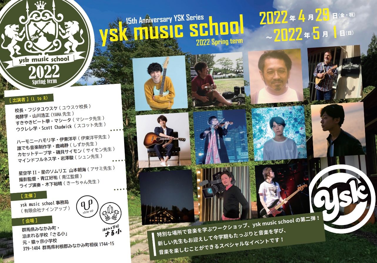 [イベントテーマ]ysk music schoolはフジタユウスケ校長がこの二年間の配信実験プログラム「ysk music labo.」で培ったノウハウを研究発表し、授業形式で皆様にお送りする学校プロジェクトです。群馬県にある実際の校舎を借り切り、「全寮制」という方式を取って宿泊をします。今回も日帰りでも各プロジェクトに参加可能です。昨年11月に開催された「ysk music school2021 Autumn term」の運営経験を踏まえ、様々な課題やご要望にお答えした特別体験型イベントの第三弾です。皆さんとともにフジタユウスケ校長自らもほぼ全てのワークショップに参加し、学習教材として事前に展開された簡易的な楽器でレコーディングに参加したり、フジタユウスケの活動15周年をお祝いすべく集まったミュージシャンたちにも講師として授業に参加してもらったり。特別な食事なども用意し、晩飯後のお楽しみなども考えています。音楽をさらに深く知り、目の前で楽しみ、参加し。音楽学校の生徒として、感染予防対策を行った上でなかなかできない「非日常の特別体験」を味わっていただけます。もちろんライブもたっぷりあります。校内はいたるところに洗面所があり、換気も良好。空調もしっかりしています。広い校舎に加え、屋外も大変広い施設となっており、ゆったりと余裕を持って楽しんでいただけます。また、浴場、シャワー、ウォシュレットトイレなど設備も充実しています。 [会場]群馬県みなかみ町・泊まれる学校「さる小」元・猿ヶ京小学校