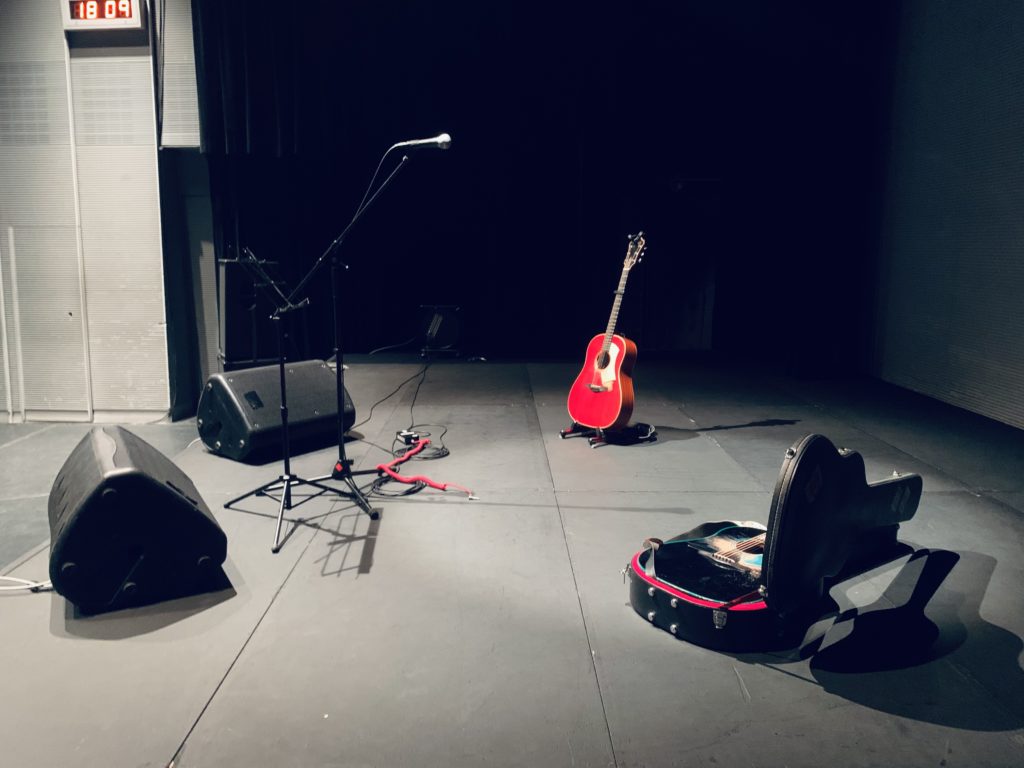 会場に入ると、ステージには一本のマイクスタンドと、使い込まれた風態のメインギター赤と黒のTRUTH TN-35が二本、そして譜面台のみというシンプルなステージに、客席は今か今かと開演を待つ期待感に包まれる。
