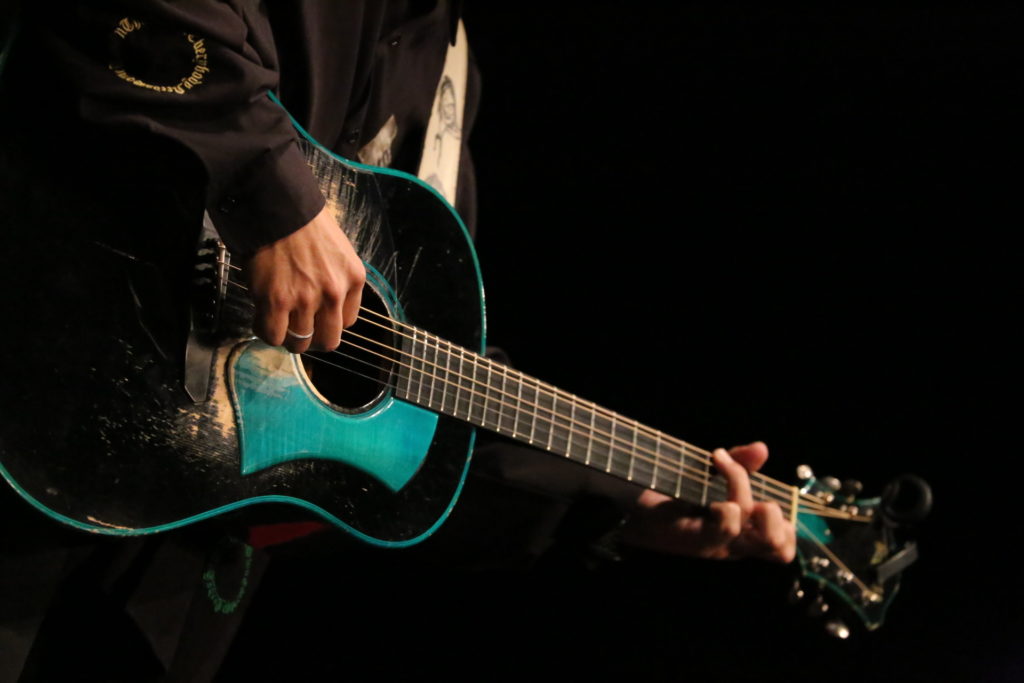 カポタストを荒々しくガッと移動させ、かき鳴らされる「ランドリー」はかつての恋人との葛藤を描いたアップテンポのギター・ロック。太いギターのサウンドと右手のビートがあいまって、この日はギター一本の弾き語りにも変わらず、まるで背景にバンドが鳴っているようだった。